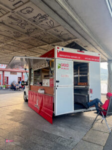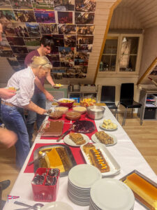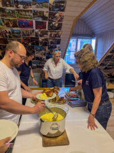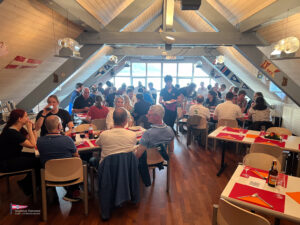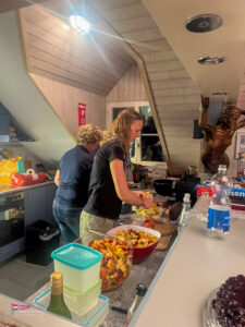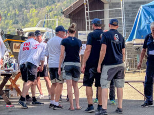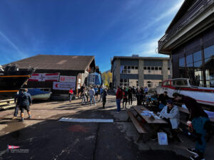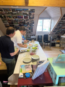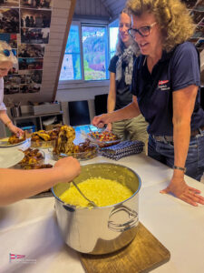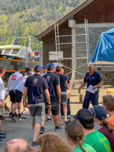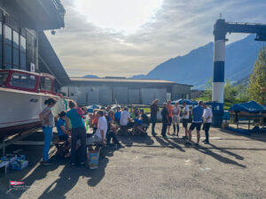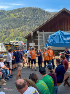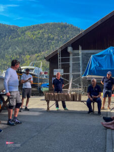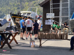 Bei einem so intensiven Tag auf dem Wasser gab es Hunger. So trafen sich am Samstagabend über 60 Personen zum Apéro vor dem SKS Klublokal und stossten auf den ereignisreichen Tag an. Währenddessen sind die Güggeli bereits auf dem Grill im Pouletwagen. Das reichhaltige Salatbuffet wurde von einem engagierten Team von Helfern zusammengestellt. Daraufhin folgte das Highlight des Abends, die frischen Güggeli mit Gusti’s Risotto. Zum Abschluss tischten die SKSler selbstgemachte Desserts auf, das auf reichlich Lob stosste.