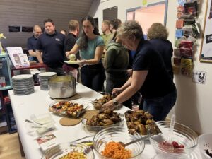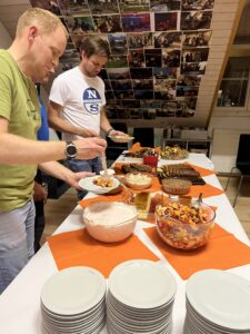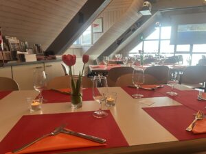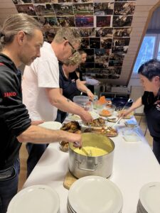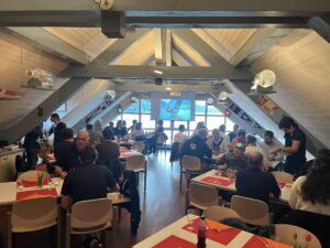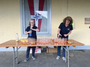 Nach der Regatta traf man sich beim Stegapéro, bevor der Samstagabend mit einem gemütlichen Nachtessen im SKS-Klublokal ausklang. Kulinarisch blieben keine Wünsche offen – das grosse Salatbuffet und das schon zur Tradition gewordene Grillpoulet mit Risotto wurde gekrönt von einem feinen Dessertbuffet.
